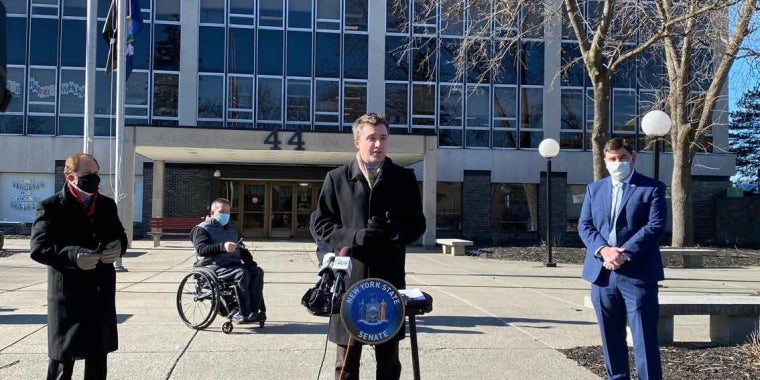 Senator James Skoufis (D-Hudson Valley) held a press conference outside the state's Office for People With Developmental Disabilities headquarters in Albany to shine a light on an issue affecting people living in state-operated group homes. Even throughout the pandemic, New York State-operated group homes/living facilities do not provide free WiFi for individuals living in the home. Senator Skoufis, lawmakers, and disability advocates called on the state to rectify this injustice immediately and announced a bill that they will introduce requiring all of the state's group homes offer free WiFi to their developmentally disabled residents.