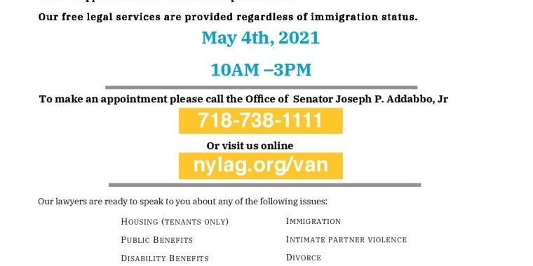 Addabbo encourages all those who are seeking legal advice to call his office to make an appointment with NYLAG.
