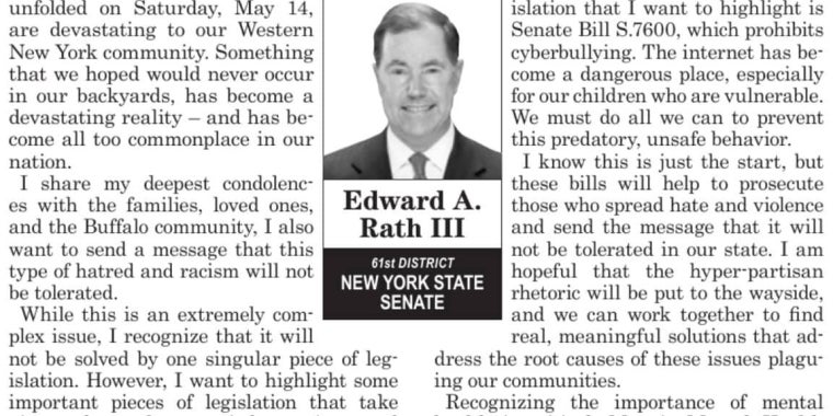There has been much happening in Albany surrounding taxes, our state budget, and the typical business that runs our State. However, I would be remiss if I did not take this opportunity to remember our fellow Western New Yorkers who tragically lost their lives. The events that unfolded on Saturday, May 14th are devastating to our Western New York Community. Something we hoped would never be able to occur in our backyards but has become all too commonplace in our Nation.