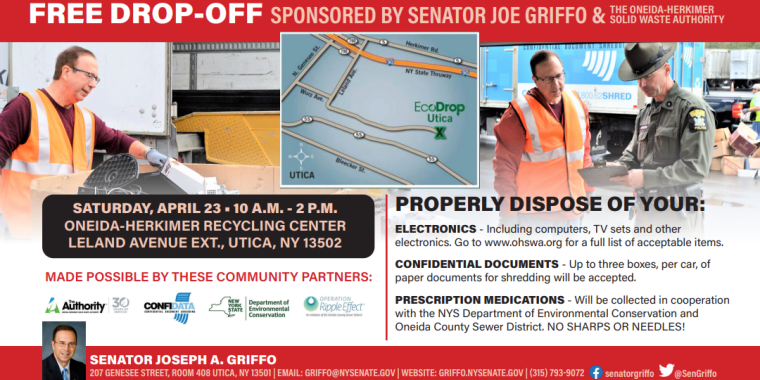 “It’s always impressive to see so many members of the community take advantage of the opportunity to safely dispose of unwanted electronics, medications and papers at recycling events I have hosted over the years,” Sen. Griffo said. “I thank the Oneida-Herkimer Solid Waste Authority, Confidata, the state Department of Environmental Conservation and the Oneida County Sewer District for partnering with me for this year’s event.”