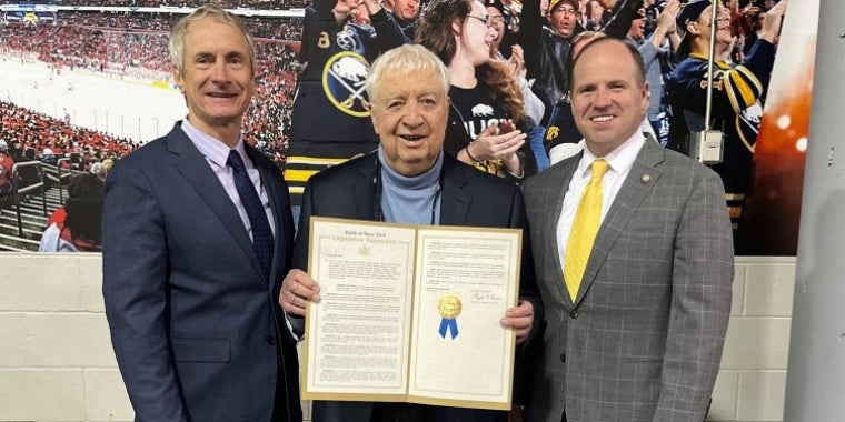 Senator Tim Kennedy said, “As I watch Rick Jeanneret's last call at the arena next to my son, I'll be reminded of my own childhood, when my father would turn down the volume on the television set and turn up the AM radio to hear RJ call Sabres games while my family sat together transfixed to the TV. 'This is how you call a hockey game,' my father would say. RJ has dedicated his entire life to the sport of hockey and to the City and people of Buffalo, and after 51 years of being the voice of the Buffalo Sabres, we're thrilled to honor him with this state resolution in recognition of his spirit and contributions to our community.”