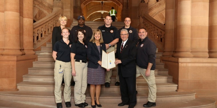 Matousek family with Tedisco, Assemblymembers Mary Beth Walsh & Matt Simpson, County Clerk Craig Hayner, Dist. Atty. Karen Heggen, Saratoga Vets Services Dir. Frank McClement, County Board of Supervisors Chair Todd Kusnierz, Galway Supervisor Mike Smith