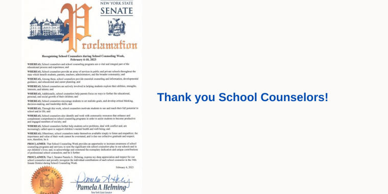 WHEREAS, Oftentimes, school counselors make themselves available simply to listen and empathize; the importance and value of their work cannot be overstated, and is due our collective gratitude and respect; now, therefore, be it