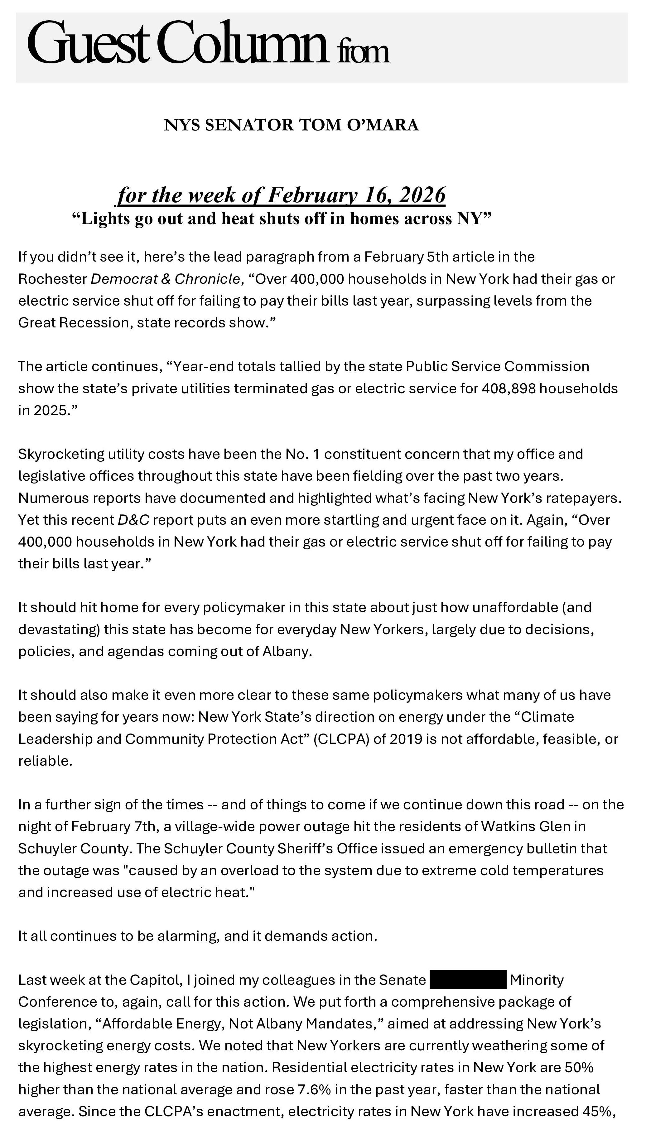 Senator O'Mara's weekly column 'From the Capitol' -- for the week of February 16, 2026 -- 'Lights go out and heat shuts off in homes across NY'