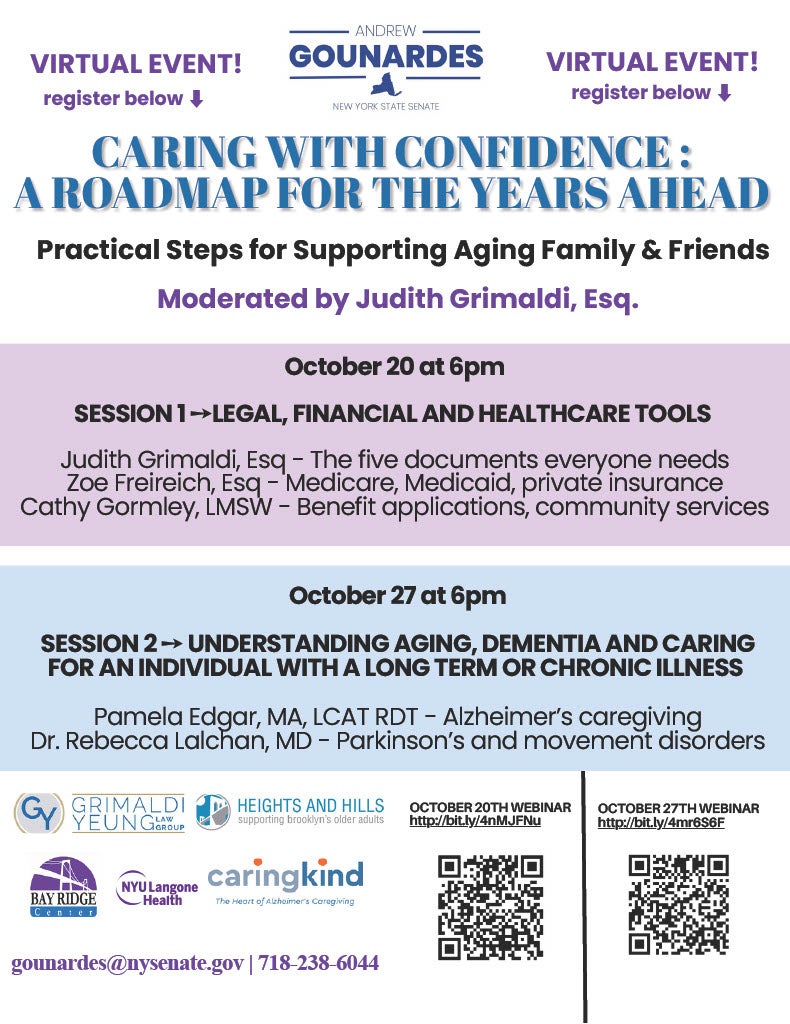 Session 1 (October 20 at 6pm) focuses on “Legal, Financial and Healthcare Tools,” featuring expert presentations on the five essential legal documents everyone needs for life planning, navigating Medicare and Medicaid, and accessing community benefits and services.