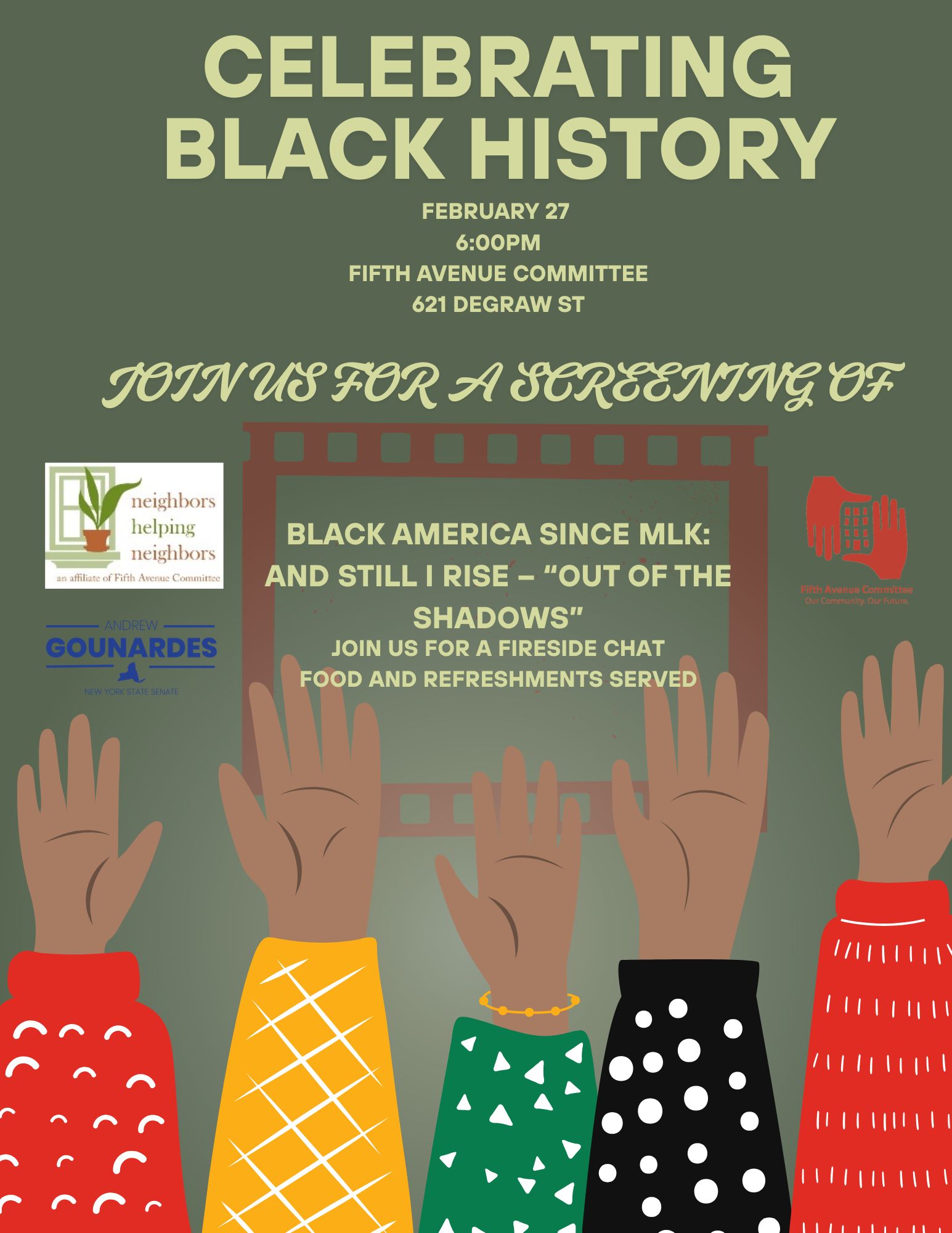Join my office and Fifth Avenue Committee next week for a screening of “Out of the Shadows,” the first part of Dr. Henry Louis Gates’ documentary series, “Black America Since MLK: And Still I Rise."