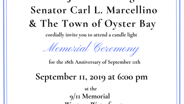 Senator James F. Gaughran, Senator Carl L. Marcellino, and the Town of Oyster Bay cordially invite you to attend a candle light memorial ceremony for the 18th anniversary of September 11th.