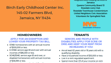 New York State Senator James Sanders Jr. will be hosting the second of a three part event series with Department of Finance to assist homeowners in reducing their property taxes and to aid tenants in applying for a rent freeze. Please review the flyer which lists all of the necessary documents needed in order to receive assistance. Call Senator Sanders' Office to RSVP at 718-327-7017 or 718-523-3069.