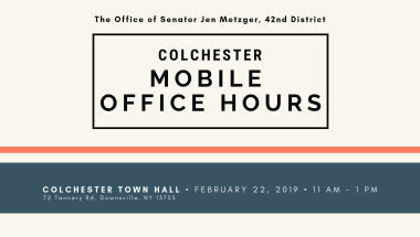 On Friday, February 22, 2019, constituent services representatives from the office of New York State Senator Jen Metzger will hold mobile office hours at Colchester Town Hall from 11 am - 1 pm.