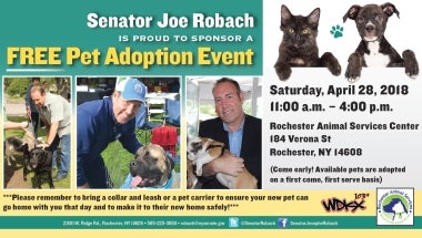 Senator Joe Robach is proud to sponsor a free pet adoption event on April 28th, from 11am-4pm at the Rochester Animal Services Center. Adoption fees will waived for all cats and dogs 6 months old and up. If interested, please come early, pets are adopted on a first come first serve basis. Additionally, please remember to bring a collar and leash or a pet carrier to ensure your new pet can go home with you that day and to make it to their new home safely.