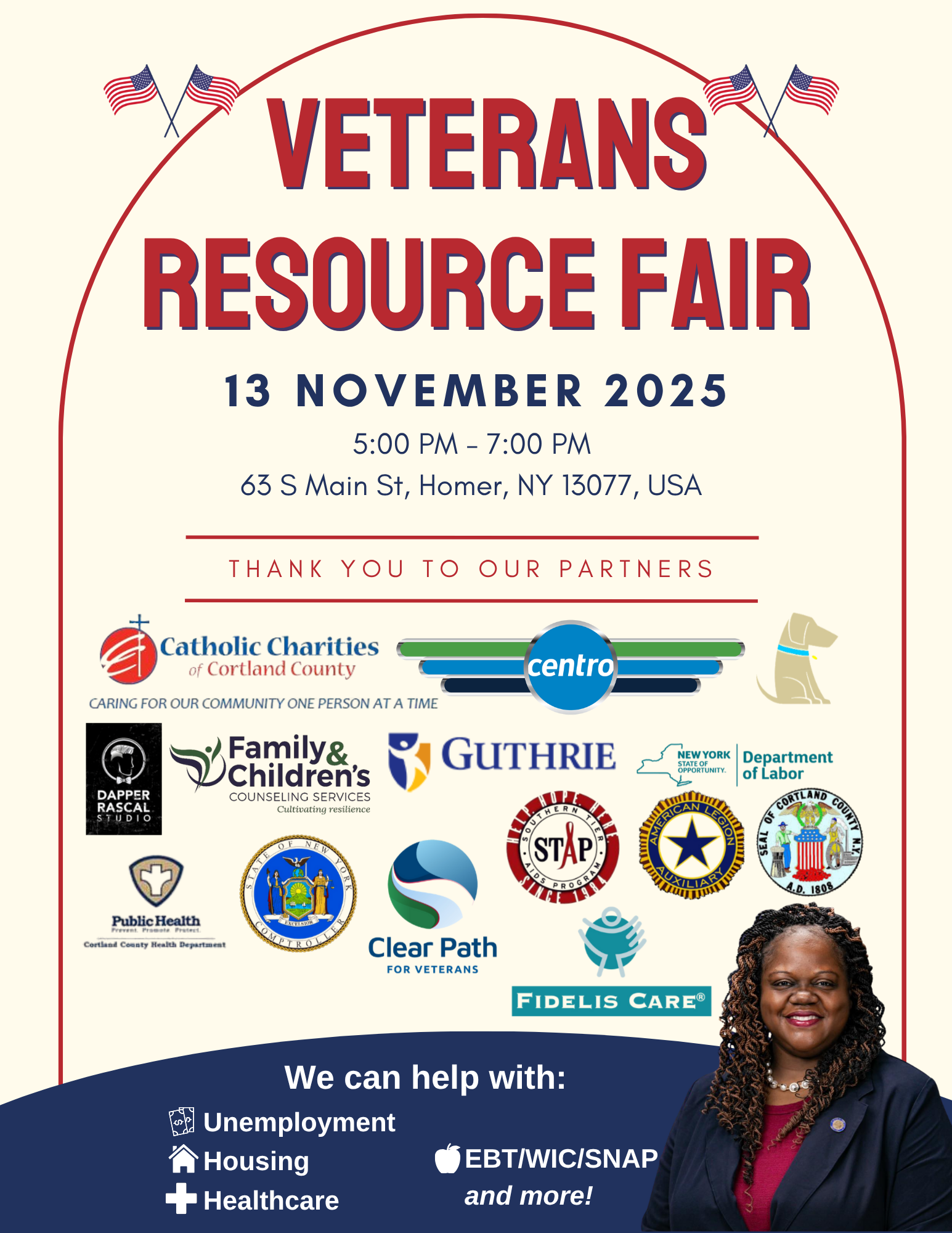 Join Senator Webb for her 3rd Annual Cortland County Veterans Resource Fair, taking place at the American Legion Post 465 on Thursday, November 13, 2025, from 5:00 PM to 7:00 PM.