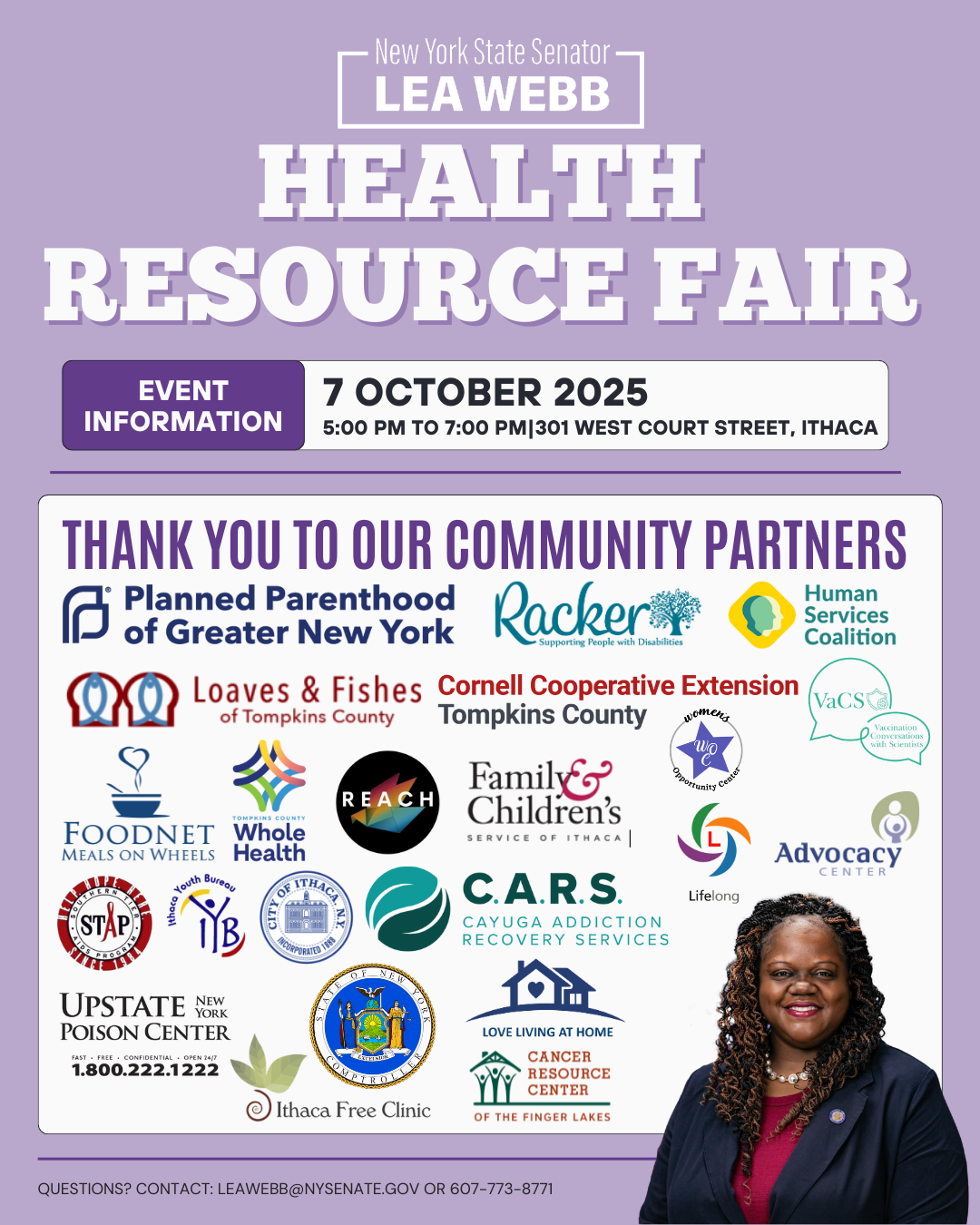 Join Senator Webb for her 3rd Annual Tompkins County Health Resource Fair, taking place at the Greater Ithaca Activities Center on Tuesday, October 7, 2025, from 5:00 PM to 7:00 PM.