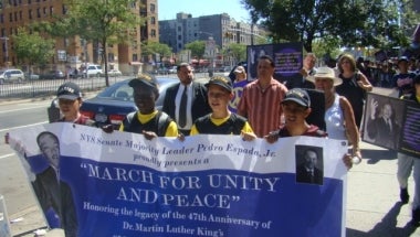 Joined by community, clergy and youth groups from the 33rd District, State Senate Majority Leader Pedro Espada, Jr. held a “march for peace and unity” on Sunday to commemorate the 47th anniversary of Rev. Dr. Martin Luther King, Jr.’s historic March on Washington, where the late civil and human rights icon delivered his “I Have a Dream” speech.