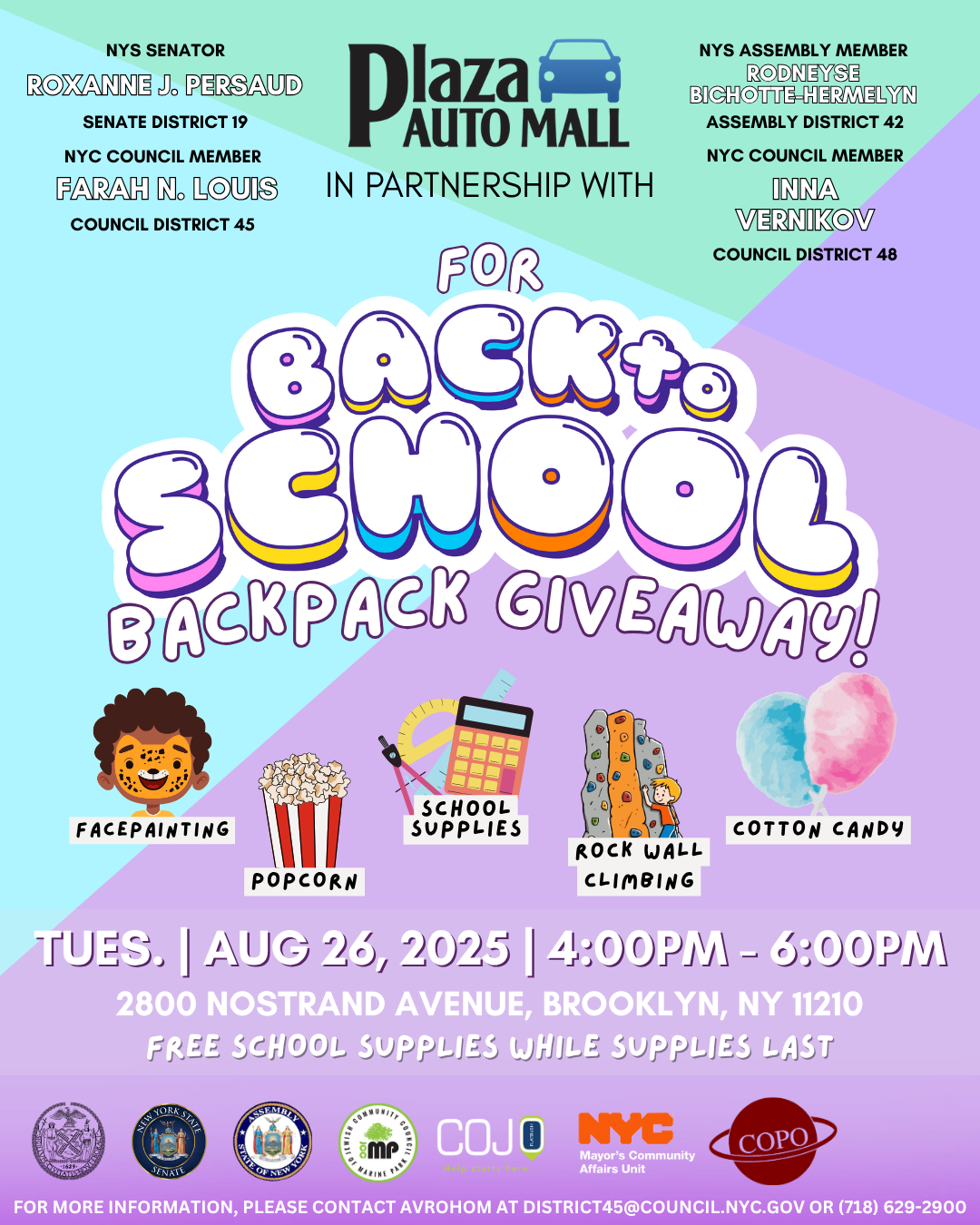 On Tuesday, August 26th, Senator Persaud will be partnering with her colleagues and Plaza Auto Mall for a Back-to-School Backpack Giveaway.