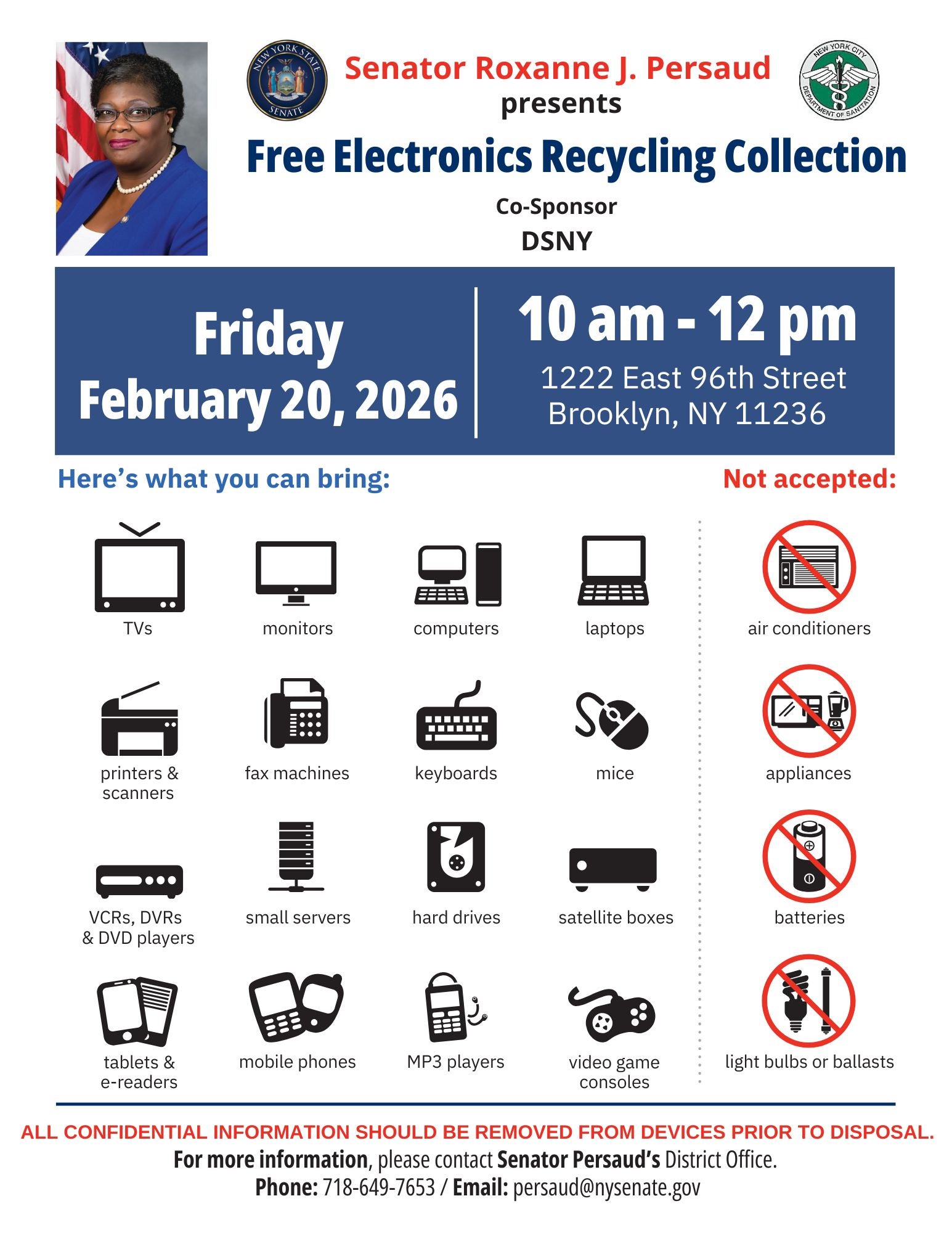 Please join us for our E-waste Recycling event on Friday, February 20th. Please note our NEW START TIME: 10am to 12pm!