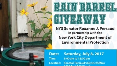 Senator Persaud is partnering with New York City Department of Environmental Protection to offer free rain barrels to homeowners to help reduce water bills, conserve drinking water, and help prevent hazardous sewer overflows into our local waterways. Rain barrels store captured storm water for your future use, such as watering your garden or washing your car. Deadline for registration is June 30, 2017. Rain barrel distribution will be on Saturday, July 8, 2017 at the District Office located at 1222 East 96th St.