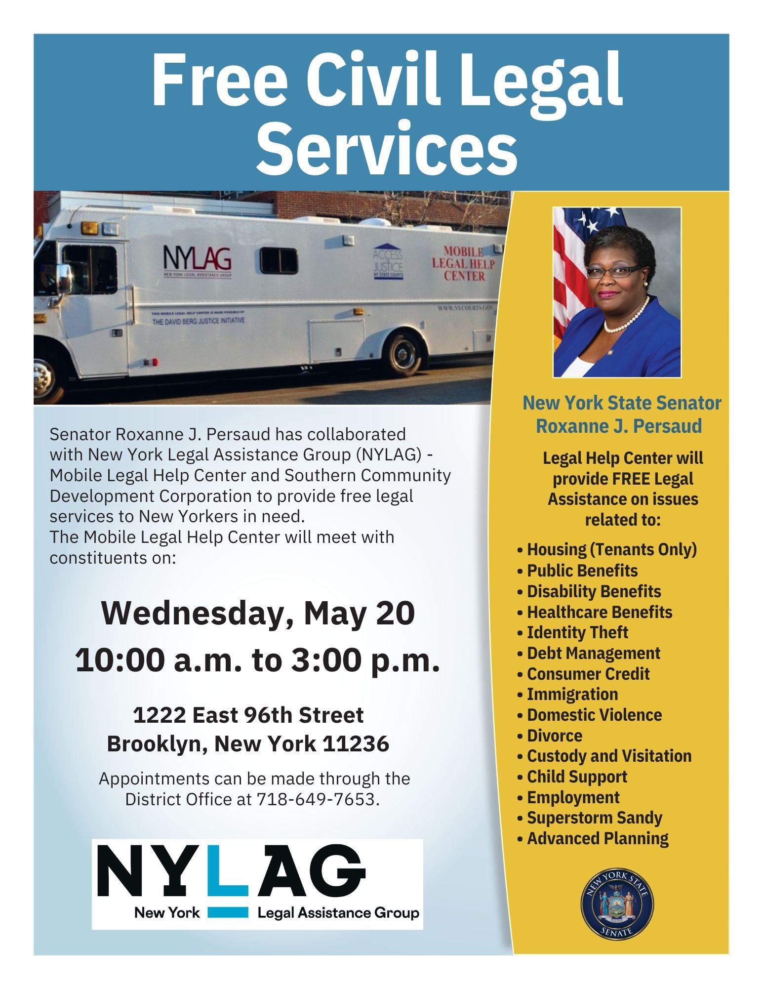 New York Legal Assistance Group - NYLAG Free Civil Legal Services will be available at my office on Wednesday, May 20th from 10am to 3pm!
