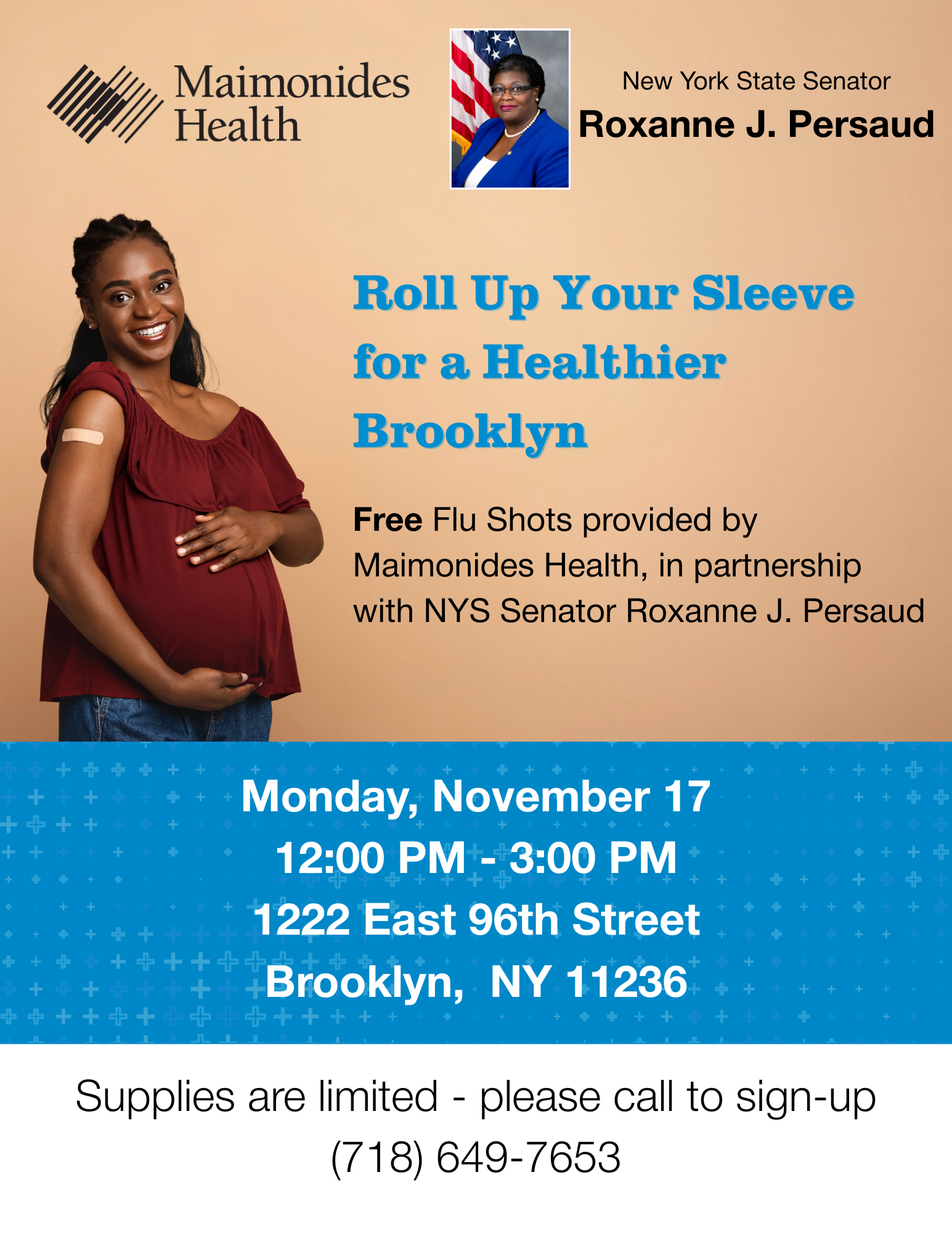 Senator Roxanne J. Persaud is partnering with Maimonides Health to host a Free Flu Shot Event on Monday, November 17, from 12 PM to 3 PM at the district office — 1222 East 96th Street, Brooklyn, NY 11236.
