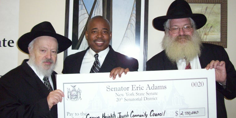 Senator Adams presents check to Dr. Harvey Lang of the Crown Heights Jewish Community Council. Funding, allocated from stimulus money, will go to weatherization projects in central Brooklyn.
