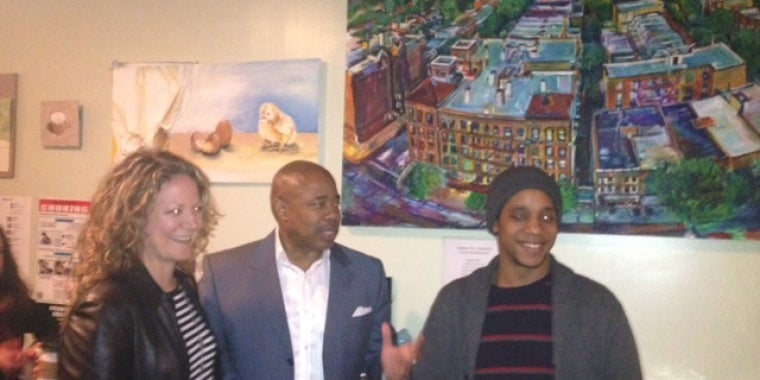 Senator Adams enjoys art show in local coffee shop in Brooklyn.