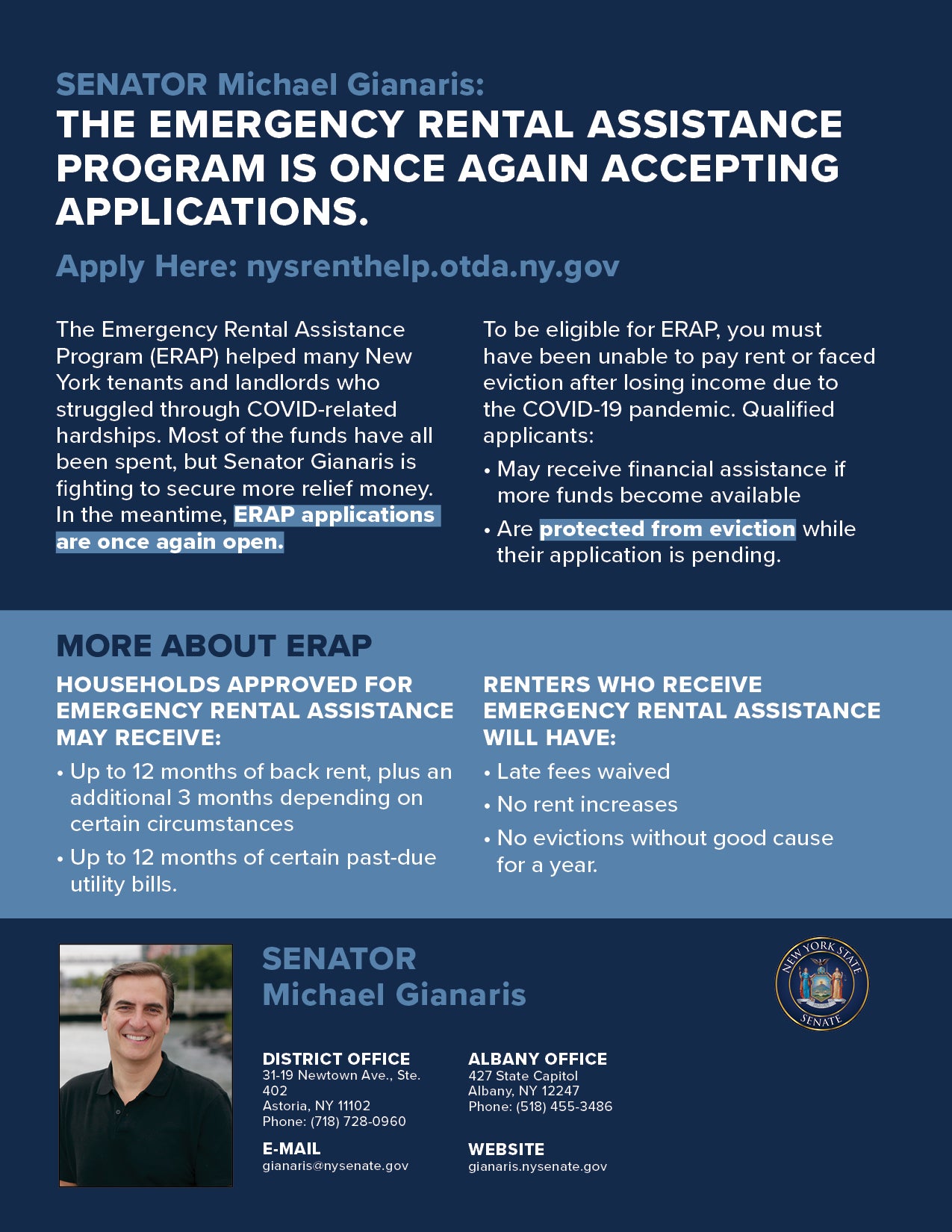 For questions or assistance with your Emergency Rental Assistance application, call (718) 728-0960 or email gianaris@nysenate.gov.