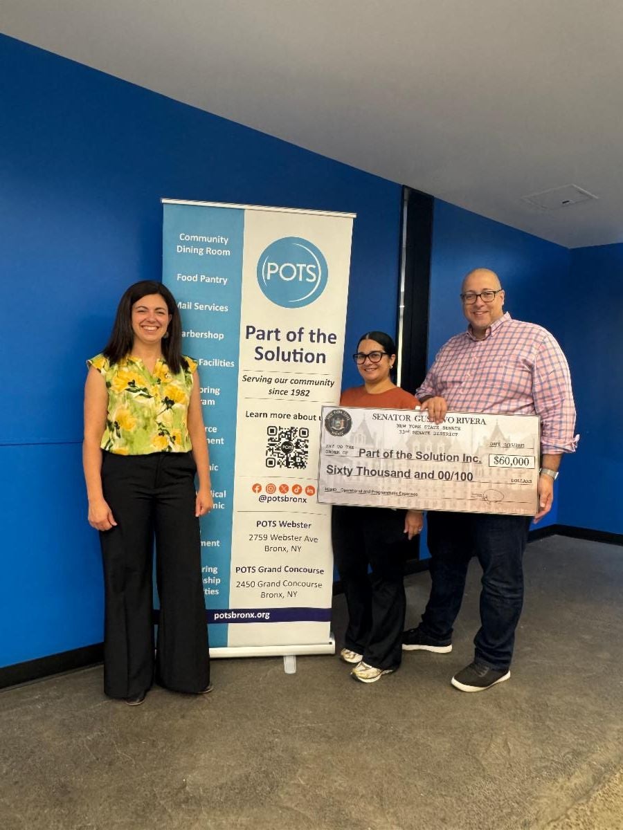(Bronx, NY) - Today, State Senator Gustavo Rivera joined Christina Hanson Executive Director of Part of the Solution (POTS) to present her with a $60,000 check to support their management and substance abuse counseling services through their Dignity and Wellness program.