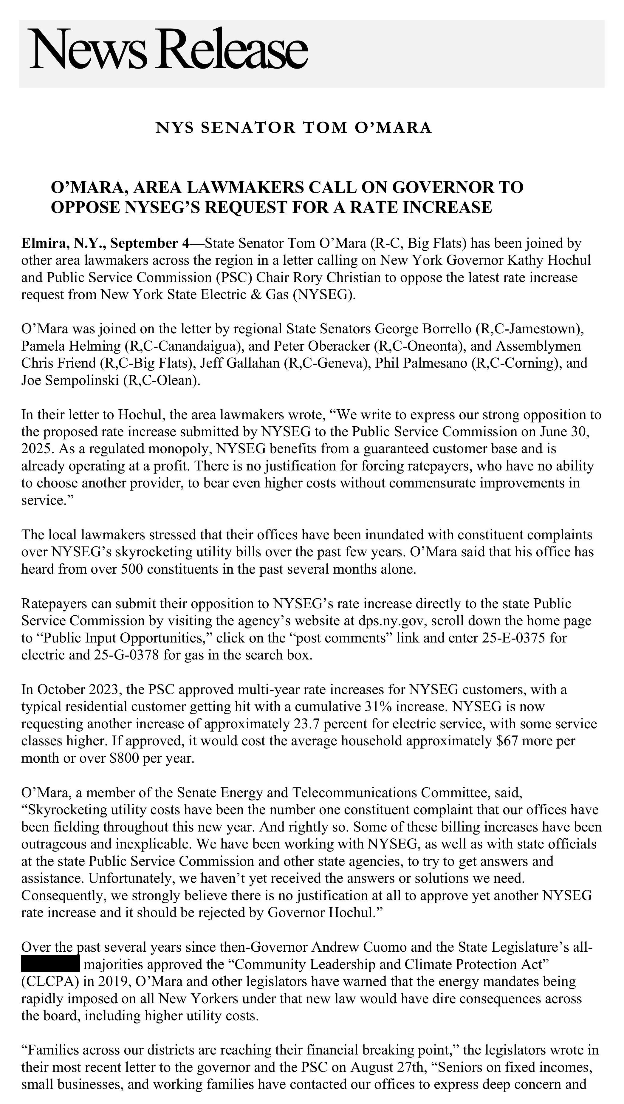 O’Mara, area lawmakers call on governor to oppose NYSEG’s request for a rate increase