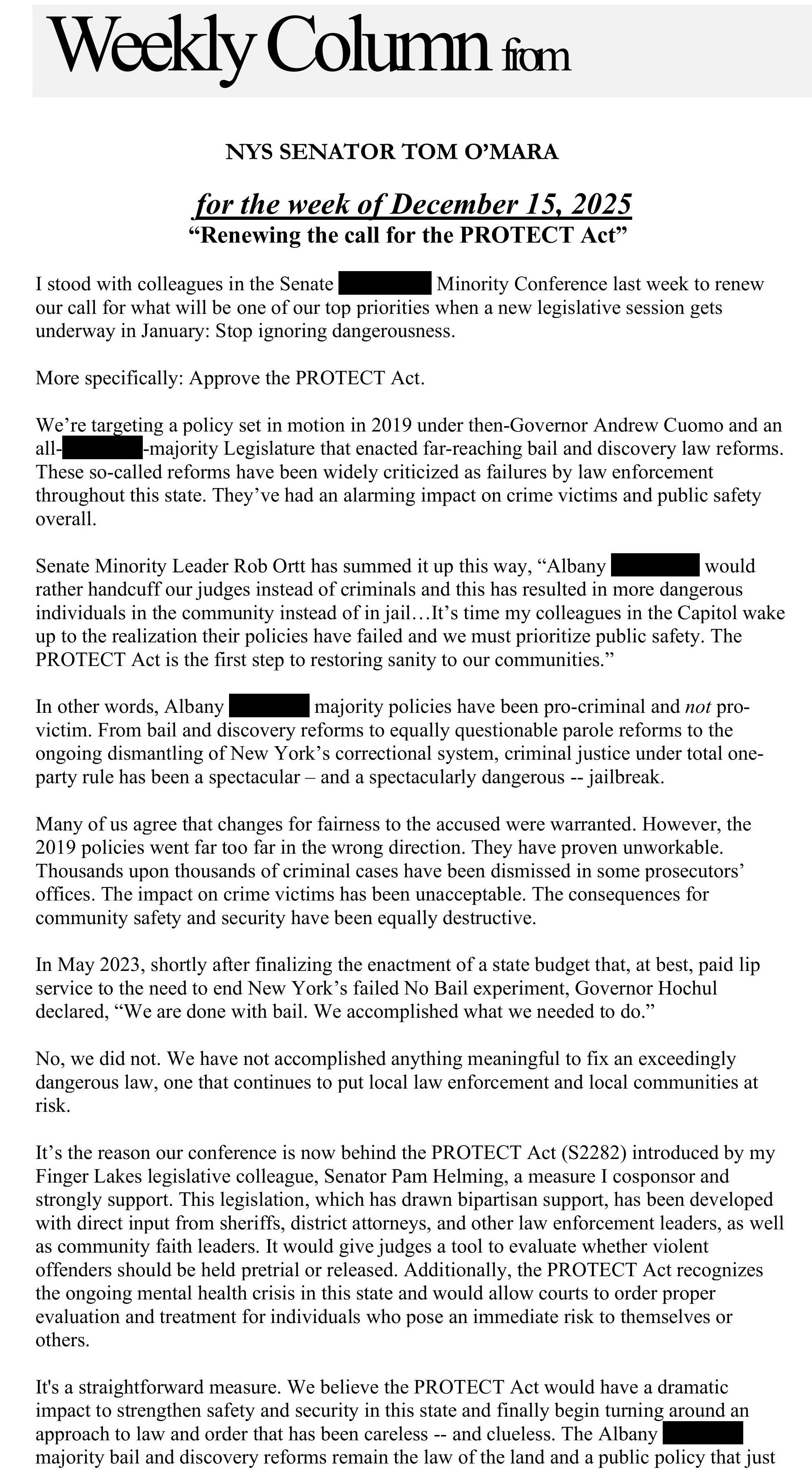 Senator O'Mara's weekly column 'From the Capitol -- for the week of December 15, 2025 -- "Renewing the call for the PROTECT Act"