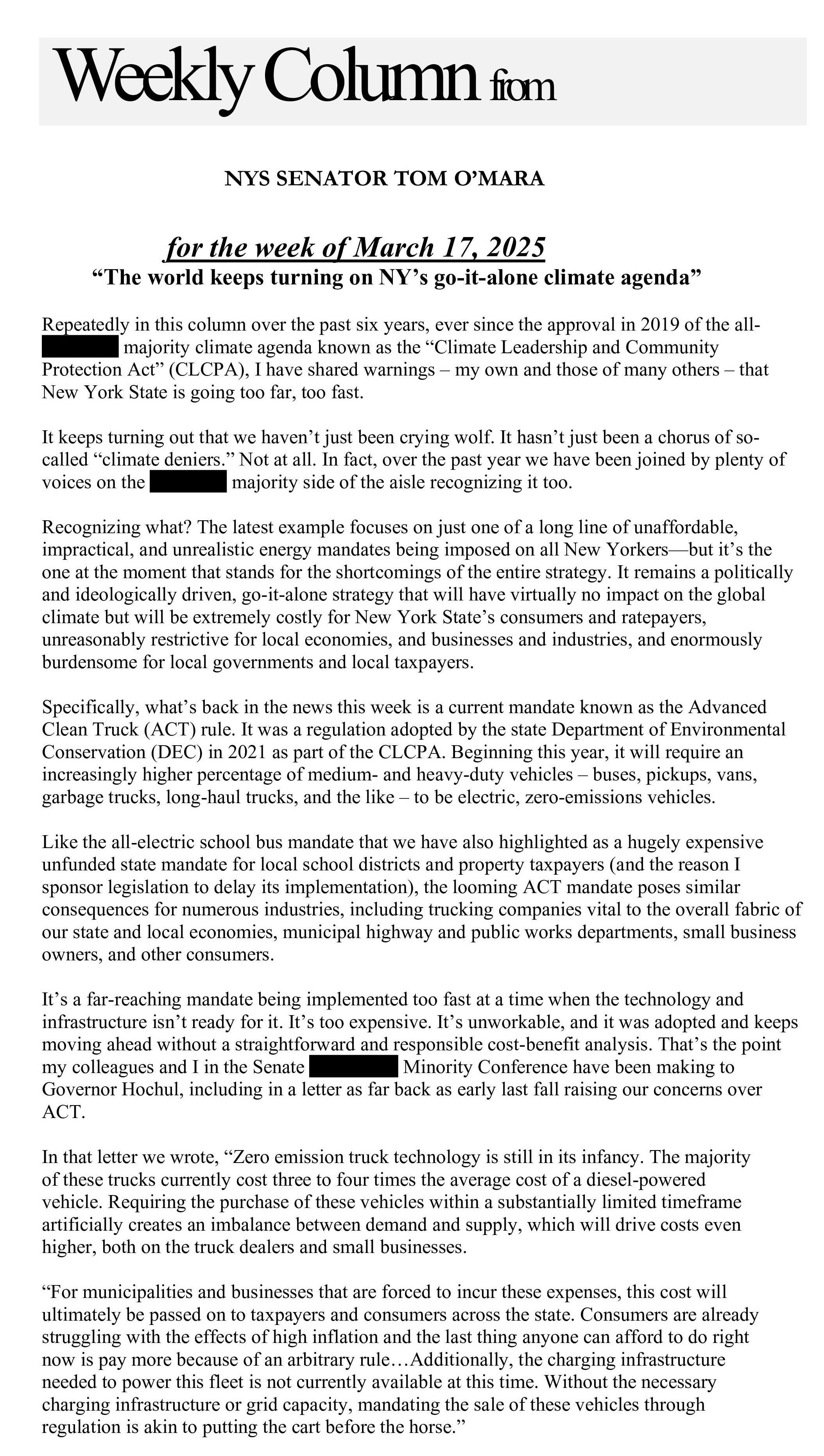 Senator O'Mara's weekly column 'From the Capitol' -- for the week of March 17, 2025 -- 'The world keeps turning on NY's go-it-alone climate agenda'