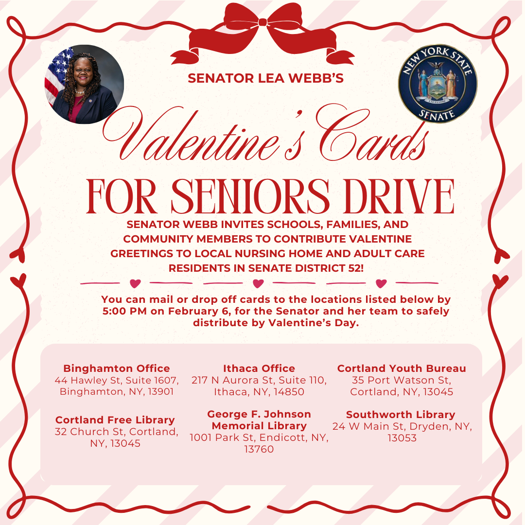 “Valentine’s Day is a reminder that connection and compassion matter at every stage of life.” said Senator Webb. “Through this initiative, we are working to ease isolation and ensure seniors in our community feel seen, appreciated, and loved. Each year, I look forward to seeing people across the Southern Tier come together to lift each other up through small acts that have a big impact.”